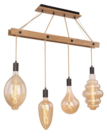 Hängeleuchte Metall schwarz matt, Holz naturfarben, ohne Schirme, LxBxH: 900x90x1200mm, exkl. 4x E27 60W 230V
