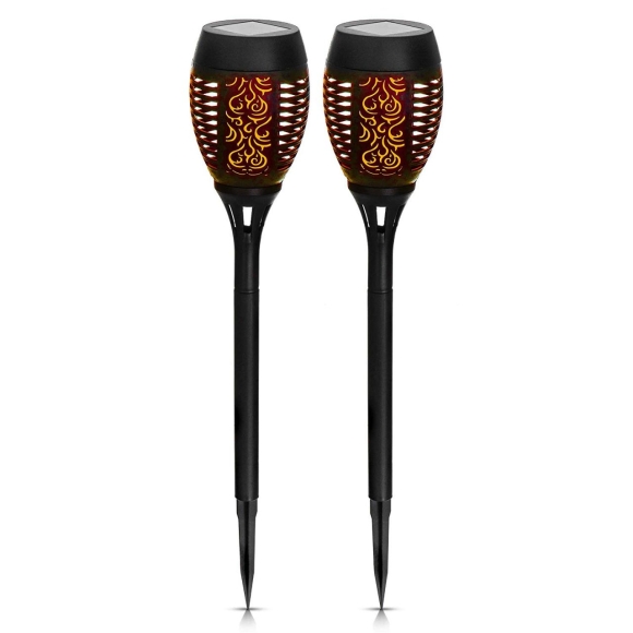 Globo Solar Leuchte - Kunststoff Schwarz 2er SetFür eine stimmungsvolle und dekorative Beleuchtung im Außenbereich sorgt die LED-Solarleuchte Fackel, die mit einem passenden Erdspieß geliefert wird. So kann die Solarfackel überall im Garten ganz einfach platziert werden. Dank des modernen Solarpanels auf der Oberseite lädt sich die Erdspieß-Leuchte tagsüber auf und kann in den Abendstunden bei voller Aufladung bis zu 8 Stunden ihr warmes Licht verbreiten. Aufgrund der Schutzart IP44 ist die Leuchte gegen Spritzwasser geschützt und somit prädestiniert für den Außenbereich. Eine Atmosphäre zum Träumen ist garantiert. (2er Pack)• Leuchtentyp: Steckleuchte• Material: Kunststoff• Farbe: schwarz• Schutzart: IP44• Dekor Stanzungen• Feuereffekt• Schalter• Akku enthalten• Leuchtdauer: 6-8 Stunden• Durchmesser x Höhe in cm: 9,5 x 50• Fassungen: 12x LED• Leuchtmittel enthalten: Ja• Leistung Leuchtmittel: 36x 0,06 Watt• Lichtfarbe: warmweiß• Spannung: 3V