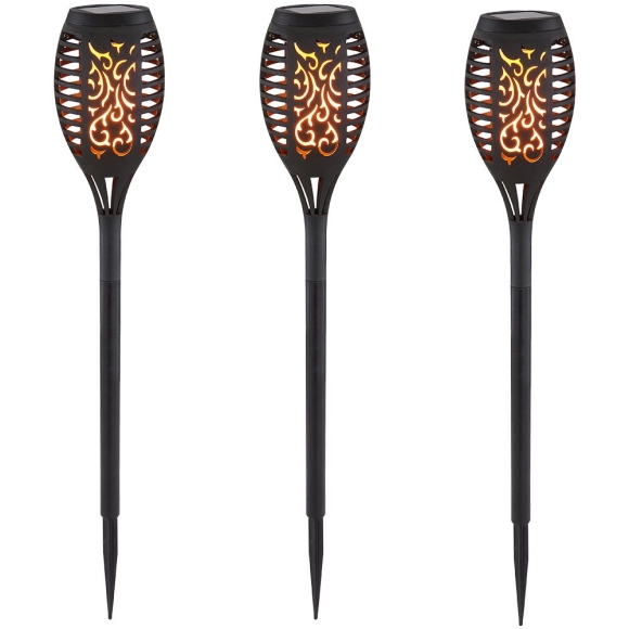 Globo Solar Leuchte - Kunststoff Schwarz 3er SetFür eine stimmungsvolle und dekorative Beleuchtung im Außenbereich sorgt die LED-Solarleuchte Fackel, die mit einem passenden Erdspieß geliefert wird. So kann die Solarfackel überall im Garten ganz einfach platziert werden. Dank des modernen Solarpanels auf der Oberseite lädt sich die Erdspieß-Leuchte tagsüber auf und kann in den Abendstunden bei voller Aufladung bis zu 8 Stunden ihr warmes Licht verbreiten. Aufgrund der Schutzart IP44 ist die Leuchte gegen Spritzwasser geschützt und somit prädestiniert für den Außenbereich. Eine Atmosphäre zum Träumen ist garantiert. (3er Set).• Leuchtentyp: Steckleuchte• Material: Kunststoff• Farbe: schwarz• Schutzart: IP44• Dekor Stanzungen• Feuereffekt• Solar• Schalter• Leuchtdauer: 6-8 Stunden• Durchmesser x Höhe in cm: 7,5 x 49,5• Fassung: 12x LED• Lichtfarbe: warmweiß• Spannung: 3V