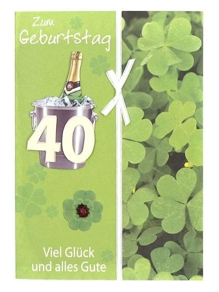 Zum 40. Geburtstag mit der passenden Geburtstagskarte gratulieren Klappkarte 40 - "Zum Geburtstag viel Glück und alles Gute",  Text innen: "Zu diesem ganz besonderen Geburtstag die besten Glückwünsche." Damit ist auf der Geburtstagskarte fast alles gesagt.   Geburtstagskarten aus unserem Geschenkeshop Über Einladungskarten, Geburtstagskarten und Grußkarten freut sich jeder, auch wenn sie ein bisschen aus der Mode gekommen zu sein scheinen. Es sind "handfeste" Gratulationen, Danksagungen oder Einladungen. Denn im Vergleich zu Grußkarten, die elektronisch versendet werden, kann man "echte" Geburtstagskarten zu Hause oder im Büro aufstellen und hat sie so immer vor Augen. Wir bieten Ihnen Geburtstagskarten für jeden Geschmack. Denn ein ansprechendes Design spielt bei den persönlichen Grüßen immer eine Rolle. Es ist wie bei einer Hochzeitskarte ganz wichtig, dass die "Aufmachung" zum festlichen Anlass passt. Einladungskarten werden häufig in einer größeren Stückzahl benötigt. Wer hat schon Zeit und Geschick genug, diese selbst zu basteln? Kaufen Sie Einladungskarten und Grußkarten deshalb bei uns im Geschenkeshop und legen Sie die eine oder andere Geburtstagskarte mit in den Warenkorb. Das Geschenk und die Grußkarten zusammen sparen Porto und Aufwand. Da Sie Geburtstagskarten immer selbst beschriften, wirken Sie beim Empfänger letztendlich doch persönlich und individuell. Bunt und fröhlich dürfen die Geburtstagskarten mit Ihren Grüßen wirken, edel und seriös sehen die Hochzeitskarten aus. Für offizielle und private Gelegenheiten finden Sie garantiert die richtige Grußkarte.  Dankeskarten sind zum Beispiel auch eine sehr schöne Möglichkeit, mit jemandem eine Beziehung zu pflegen. Egal, ob diese Grußkarte als Dank für die Geschenke nach einem Fest versendet wird, oder ob die Dankeskarte jemanden zwischendurch erreicht, dem man einfach einmal von ganzem Herzen "Danke" sagen möchte. So haben Geburtstagskarten und Dankeskarten je Ihre ganz eigene Bedeutung. Unsere Geburtstagskarten sind im Gegensatz zu den Geburtstagskarten, die in so manchem Ladengeschäft erhältlich sind, weder altmodisch noch kitschig und da es sich um Klappkarten handelt, haben Sie genügend Platz für persönliche Zeilen. Auch ein Foto oder ein Geldschein findet in den Geburtstagskarten Platz. Es gehört ein weißer Briefumschlag zu jeder Karte dazu.