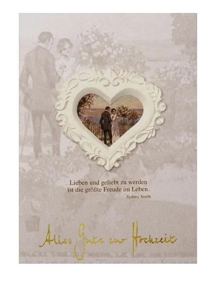 Hochzeitskarte mit Spruch Klappkarte mit dem Text: "Alles Gute zur Hochzeit - Lieben und geliebt zu werden ist die größte Freude im Leben." Hochzeitskarten sind unter den Grußkarten die wichtigsten. Über Einladungskarten, Geburtstagskarten und andere Klappkarten freut sich jeder, auch wenn sie ein bisschen aus der Mode gekommen zu sein scheinen. Doch gerade bei einem feierlichen Anlass, wie einer Hochzeit, sind "handfeste" Gratulationen angemessen. Denn im Vergleich zu Grußkarten, die elektronisch versendet werden, kann man "echte" Geburtstagskarten zu Hause oder im Büro aufstellen und hat sie so immer vor Augen. Die Wünsche beim Handschlag zur Hochzeit werden allzu schnell wieder vergessen. Hochzeitskarten aus dem 1a-Geschenkeshop Wir bieten Ihnen Hochzeitskarten für jeden Geschmack und passend zum festlichen Anlass . Denn ein ansprechendes Design spielt bei den persönlichen Grüßen immer eine wichtige Rolle.  Edel und seriös sehen die Hochzeitskarten aus - genau das Richtige für offizielle und private Gelegenheiten. Hochzeitskarten können Sie als kleinen Vorrat anlegen und in einer größeren Stückzahl bestellen. Wer hat schon Zeit und Geschick genug, Hochzeitskarten selbst zu basteln? Kaufen Sie deshalb ein Geschenk zur Hochzeit bei uns im 1a-Geschenkeshop und legen Sie die eine oder andere Geburtstagskarte gleich mit in den Warenkorb. Das Geschenk und die Grußkarten zusammen sparen Porto und Aufwand. Da Sie Hochzeitskarten immer selbst beschriften, wirken Sie beim Empfänger letztendlich doch persönlich und individuell.  An Grußkarten bieten wir natürlich zusätzlich noch eine sehr gute Auswahl, unabhängig vom Anlass "Hochzeit". Dankeskarten sind zum Beispiel auch eine sehr schöne Möglichkeit, mit jemandem eine Beziehung zu pflegen. Egal, ob diese Grußkarte als Dank für die Geschenke nach einem Fest versendet wird oder ob die Dankeskarte jemanden zwischendurch erreicht, dem man einfach einmal von ganzem Herzen "Danke" sagen möchte. So haben Geburtstagskarten und Dankeskarten je Ihre ganz eigene Bedeutung. Unsere Hochzeitskarten sind im Gegensatz zu den Hochzeitskarten, die in so manchem Ladengeschäft erhältlich sind, weder altmodisch noch kitschig und da es sich um Klappkarten handelt, haben Sie genügend Platz für persönliche Zeilen. Auch ein Foto oder ein Geldschein findet in den Geburtstagskarten Platz. Es gehört ein weißer Briefumschlag zu jeder Karte dazu.