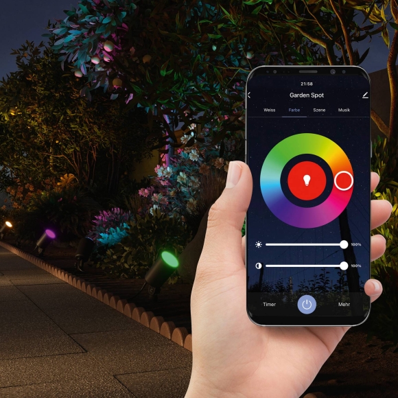 Ausrichtbarer Gartenstrahler mit Erdspieß, smart steuerbar, RGBW-Farbwechsel Akzente im eigenen Garten setzen ist mit diesem WLAN-Gartenstrahler kein Problem. Der smart steuerbare Strahler kann entweder mit dem aus Aluminium gefertigten Erdspieß in den Boden gesteckt werden oder mithilfe der Bodenplatte auf festem Untergrund montiert werden. So ergibt sich auch die Möglichkeit ihn an der Wand oder Decke zu befestigen. Dank der Steckerzuleitung kann er mühelos an der nächsten Steckdose angeschlossen werden. Er dient als Lichtspender, Effektbeleuchtung oder auch um eine besondere Lichtatmosphäre zu erzeugen. Dazu ist er absolut wetterfest und kann per App oder Sprache gesteuert werden. Am Gelenk des Erdspießes wie auch des Montagefußes lässt sich der Winkel des Gartenspots beliebig einstellen, um Baumkronen magisch zu illuminieren, Gartenwege hell zu erleuchten oder Akzente an der Gartenmauer zu setzen. Es kann aus 16 Millionen Farben genau die passende für die aktuelle Stimmung oder den Anlass gewählt werden. Zusätzlich sind ein bunter Farbwechsel, eine Auswahl im Weißlichtspektrum und auch die stufenlose Dimmbarkeit weitere Möglichkeiten der Lichtgestaltung, die sich mit diesem Strahler eröffnen. - mit der Hama Smart Home App ist jederzeit eine Steuerung von unterwegs möglich - funktioniert ganz ohne Gateway (Hub), der WLAN-Gartenstrahler stellt eine Wifi-Direktverbindung zum Router her - hohe Kompatibilität: funktioniert mit Amazon Alexa, Google Assistant, Siri Shortcuts, iOS und Android, zudem lassen sich alle mit Alexa- und Google-Assistant-kompatiblen Smart-Home-Produkte anderer Hersteller verknüpfen - Zeitsteuerung möglich, sowie das Bilden von Gruppen und Szenen mit im WLAN eingebundenen Geräten - Außenleuchte mit 1,5 m Stromkabel mit IP44-Konturenstecker - die Daten werden ausschließlich auf deutschen Servern gespeichert - Systemvoraussetzungen Betriebssystem: Android 4.4 und iOS 8.0 oder höher Hinweis zur Nutzung mit Amazon Alexa/Google Assistant: Dazu muss der sogenannte Alexa-Skill "Hama Smart Home" in der Alexa-App/"Hama Smart Home"-Dienst in der Google Home App aktiviert werden.