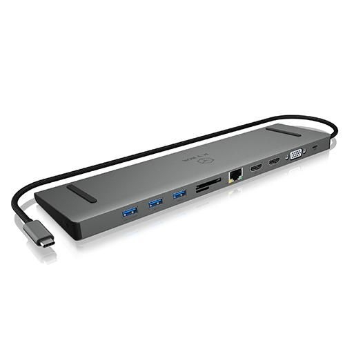 Haupteigenschaften  Hochwertiges und stylisches Aluminiumgehäuse USB Type-C™ mit Power Delivery Versorgt Ihr Notebook mit bis zu bis zu 100 W über den USB Type-C™ Anschluss Drei zusätzliche Videoanschlüsse: 2x High Speed HDMI® Type-A (bis zu 3840x2160@30 Hz) 1x VGA Anschluss bis zu 1920x1200@60 Hz Drei USB 3.0 Type-A Anschlüsse mit Datenübertragungsrate bis zu 5 Gbit/s Single-LUN SD 3.0 (UHS-I) und microSD 3.0 (UHS-I) Kartenleser für Datenübertragungen bis zu 100 MB/s Gigabit LAN RJ45 Schnittstelle mit Wake-on-LAN Funktion 3,5 mm Kombi-Headset-Anschluss