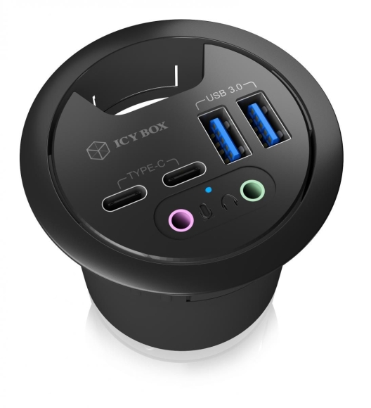 ICY BOX IB-HUB1403B, 4 Port USB 3.0 Tisch-Hub mit Type-C™Oh nein, nicht schon wieder..Tief einatmen. Stuhl nach hinten schieben, etwas unter das Knie legen und dann ewig den USB und AudioAnschluss auf der Rückseite des Computers suchen. Dank des IB-HUB1403B gehört dieses alltägliche Ritualsowohl Zuhause als auch auf der Arbeit der Vergangenheit an.Kleine SchaltzentraleSchließen Sie mit dem IB-HUB1403B Ihre oft genutzten USB Type-C™ und USB Type-A Geräte sowie IhrHeadset einfach in Sicht- und Reichweite auf ihrem Schreibtisch an.Kein KabelsalatDank der Kabeldurchführung, müssen Sie selbst nach dem Einbau des IB-HUB1403B, nicht auf dieOrdnung an Ihrem Schreibtisch verzichten. Legen sie einfach Ihre Kabel durch die Kabeldurchführung desIB-HUB1403B.