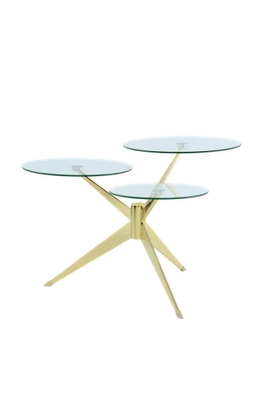 **Moderner Beistelltisch mit Stil**Dieser Tisch ist ein absoluter Hingucker. Drei runde, versetzt zueinander angeordnete Tischplatten bieten eine moderne Optik für moderne und klassische Einrichtungen und gleichzeitig flexible Nutzungsmöglichkeiten. Platzieren Sie dekorative Vasen und Figuren auf dem Tischchen und nutzen Sie es gleichzeitig zur Ablage verschiedener Gegenstände und Utensilien. Ob als Beistelltisch im Wohnbereich oder als Ablageplatz für Schlüssel und weitere täglich genutzte Dinge im Flur – dieses Tischmodell ist in jedem Raum ein praktisches Möbelstück.Die Harmonie zwischen den Tischplatten und dem Metallgestell sorgt für eine elegante Optik, die Ihrem Zuhause das gewisse Etwas verleiht.
