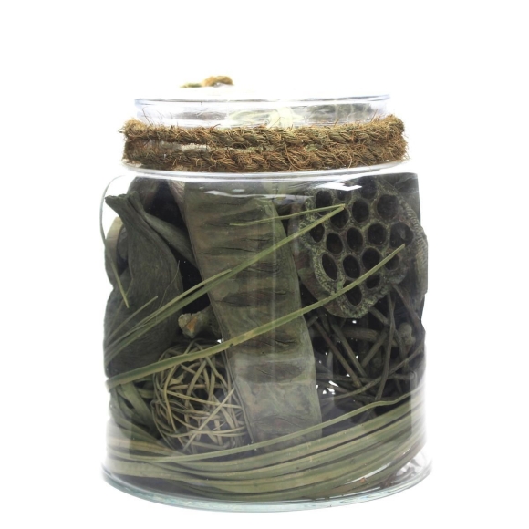 **Dekoglas für Ihr Zuhause**Dieses schöne Dekoglas eignet sich hervorragend zur Platzierung auf Tischchen, Regalen oder Anrichten. Es lässt sich durch die Höhe von ca. 20 cm und den Durchmesser von ca. 18 cm beliebig platzieren. Der exotische Mix getrockneter Pflanzenteile in Grüntönen, mit dem das transparente Glas gefüllt ist, ist am Rand mit einer doppelten Kordel verziert. Für das eigene Zuhause oder als Geschenk – das schlichte Design und die Naturfarben passen ideal in jede Einrichtung und zu jedem Wohnraum. Durch die Handfertigung und die Naturmaterialien ist jedes Glas ein einzigartiges, individuell befülltes Unikat, das vom Bild abweichen kann.