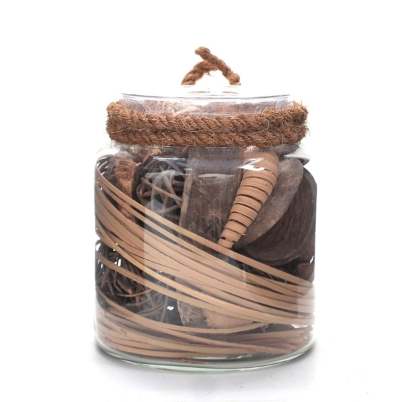 **Dekoglas für Ihr Zuhause**Dieses schöne Dekoglas eignet sich hervorragend zur Platzierung auf Tischchen, Regalen oder Anrichten. Es lässt sich durch die Höhe von ca. 20 cm und den Durchmesser von ca. 18 cm beliebig platzieren. Der exotische Mix getrockneter Pflanzenteile in Brauntönen, mit dem das transparente Glas gefüllt ist, ist am Rand mit einer doppelten Kordel verziert. Für das eigene Zuhause oder als Geschenk – das schlichte Design und die Naturfarben passen ideal in jede Einrichtung und zu jedem Wohnraum. Durch die Handfertigung und die Naturmaterialien ist jedes Glas ein einzigartiges, individuell befülltes Unikat, das vom Bild abweichen kann.