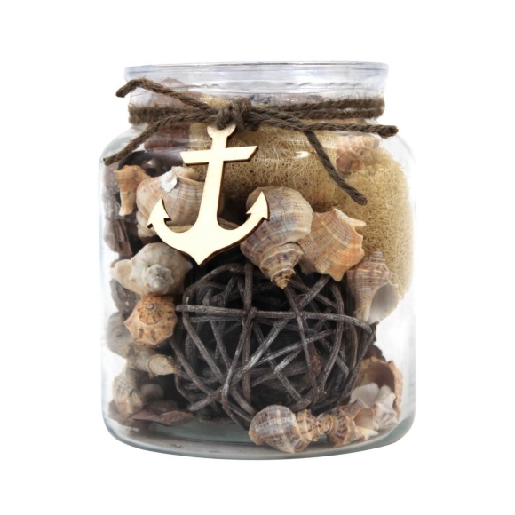 **Dekoglas für Ihr Zuhause**Dieses schöne Dekoglas eignet sich hervorragend zur Platzierung auf Tischchen, Regalen oder Anrichten. Das transparente Glas besticht durch die cremefarbene Füllung aus polierten Muscheln und getrockneten Pflanzenteilen und macht besonders im Badezimmer etwas her. Der Rand des Glases ist mit einer doppelten Kordel verziert, an der ein Anker-Anhänger befestigt ist, der das maritime Flair des Glases unterstreicht. Das Dekoglas lässt sich durch die Höhe von ca. 16,5 cm und den Durchmesser von ca. 13,5 cm beliebig platzieren. Für das eigene Zuhause oder als Geschenk – das schlichte Design und die Naturfarben passen ideal in jeden Einrichtungsstil. Durch die Handfertigung und die Naturmaterialien ist jedes Glas ein einzigartiges, individuell befülltes Unikat, das vom Bild abweichen kann.