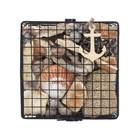 **Dekokorb für Ihr Zuhause**Dieser schöne Drahtkorb aus schwarzem Metall eignet sich hervorragend zur Platzierung auf Tischchen, Regalen oder Anrichten. Der Metallkorb besticht durch die Füllung aus polierten Muscheln und macht besonders im Badezimmer etwas her. Der am Korb befestigte Anker-Anhänger bringt das maritime Flair des Korbes besonders gut zur Geltung. Der Metallkorb lässt sich durch die das quadratische Format mit ca. 18 x 18 cm und einer Tiefe von ca. 10 cm beliebig platzieren. Für das eigene Zuhause oder als Geschenk – das schlichte Design und die Naturfarben passen ideal in jeden Einrichtungsstil. Durch die Handfertigung und die Naturmaterialien ist jedes Glas ein einzigartiges, individuell befülltes Unikat, das vom Bild abweichen kann.