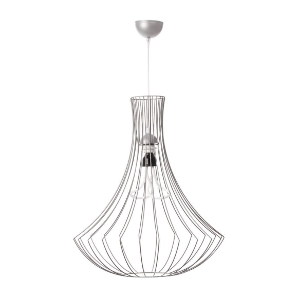 **Stilvolle Deckenlampe in minimalistischem Design**Wenn Sie in Ihrer Umgebung neue Akzente setzen möchten, dann sind Sie mit dieser Deckenlampe gut beraten. Die Lampe gibt sich in industriellem, minimalistisch gehaltenen Design. Das Gestell des Lampenschirms aus beschichtetem Draht wurde stilvoll in Form gebracht. Gleichmäßige Abstände zwischen den einzelnen Drahtsträngen sorgen für ein harmonisches Gesamtbild und integrieren die ansonsten schlichte Lampe optimal in Ihre Wohneinrichtung. Durch den außergewöhnlichen Lampenschirm ergeben sich bei eingeschaltetem Licht tolle Strahleneffekte, die dem Raum eine bezaubernde Atmosphäre verleihen. Doch egal ob die silberne Lampe ein- oder ausgeschaltet ist – sie ist jederzeit dekorativ und trendig. Die Deckenlampe ist in verschiedenen dezenten Farben, wie Schwarz, Weiß, Gold oder Silber, sowie unter anderen Namen in verschiedenen attraktiven und zum Teil außergewöhnlichen Formen erhältlich. Jede Form hat dabei ihren ganz eigenen Charakter, der sich auch auf den Raum überträgt. In unserem Sortiment ist für jeden Geschmack und jeden Anspruch die passende Form dabei. Ob flach mit einer geringen Höhe von ca. 25 cm oder länglich und schmal mit ca. 60 cm Höhe für höhere Räume – schauen Sie sich unsere verschiedenen Hängelampen der Serie an. Metallteile zur Aufhängung und ein farblich passendes Kunststoffkabel von ca. 80 cm Länge komplettieren das Produkt. Bestellen Sie Ihre Lieblingsvariante als Einzelstück oder auch eine Kombination verschiedener Varianten. Entwickeln Sie mit diesen Lampen eine individuelle Raumbeleuchtungs-Komposition, die Ihr persönliches Einrichtungs-Konzept hervorragend ergänzt. Setzen Sie zum Beispiel Ihre Bilder und Gemälde mit der attraktiven Lampe gekonnt in Szene oder machen Sie es sich im Schein der Lampe auf einem bequemen Sitzkissen gemütlich.Der Lampenschirm ist unten geöffnet, sodass Leuchtmittel ganz einfach getauscht werden können. Benötigt werden E27-Leuchtmittel mit max. 40 Watt, die im Lieferumfang nicht enthalten sind.