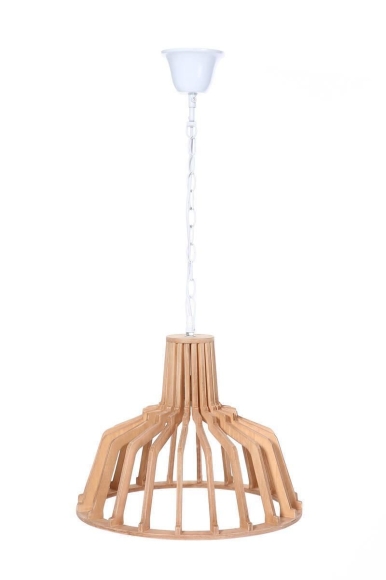 **Holzerne Design-Pendelleuchte**Natürliches Material und minimalistisches Design sind Merkmale dieser schönen Design-Pendelleuchte. Ein besonderes Highlight ist der aus schmalen Sperrholz-Streben bestehende Lampenschirm, der durch die Offenheit einen direkten Blick auf das Leuchtmittel zulässt. Ein weiterer Vorteil der Öffnungen ist, dass die volle Lichtkraft in den Raum gelangt und ihn mit warmem Licht erfüllt. Das Licht wird bei dieser Pendelleuchte nicht wie bei einem geschlossenen Lampenschirm abgeschwächt. Die nach unten gerichtete Lampe eignet sich hervorragend zur Beleuchtung des Küchen- oder Esstisches, aber auch für alle anderen Bereiche. Durch das an den Holzstreben brechende Licht entstehen schöne Lichteffekte an der Wand, die zu atmosphärischen Stimmung beitragen. Durch das natürliche Aussehen der Pendellampe kann sie vielseitig mit unterschiedlichen Einrichtungen kombiniert werden und macht sowohl bei modernen, rustikalen und vielen anderen Wohnstilen eine gute Figur. Besonders gut setzen Sie die Lampe in Szene, wenn Sie sie mit dekorativen Produkten oder kuscheligen Teppichen kombinieren. Der Lieferumfang umfasst keine Leuchtmittel.