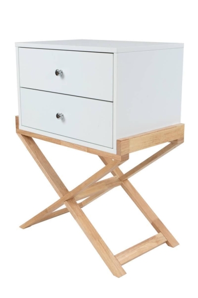 **Schränkchen mit Stauraum**Mit diesem Schränkchen erhalten Sie nicht nur ein neues Möbelstück, sondern auch zusätzlichen Stauraum. In den beiden praktischen Schubladen lässt sich das Hab und Gut verstauen, dass nicht auf den ersten Blick sichtbar sein soll. Auf der Oberfläche des Schränkchens lässt sich zudem schöne Dekoration platzieren. Kombinieren Sie das Schränkchen mit weiteren Möbeln der Serie und schaffen Sie so nicht nur Ordnung, sondern auch ein einheitliches Einrichtungsbild in Ihren vier Wänden. Selbstverständlich ist das Schränkchen auch mit anderen modernen Möbeln kombinierbar. Ein bewusster Stilbruch kann in Zusammenstellung mit klassischen oder gar antiken Möbeln erzeugt werden. Einen schönen optischen Kontrast zu dem weißen MDF-Korpus des ca. 75,5 cm hohen und ca. 56 cm breiten Schränkchens bildet das natürliche Gestell aus Kautschukholz. Mit den richtigen Accessoires und Dekoartikeln setzen Sie Ihre Möbel in Szene und schaffen eine einzigartige Atmosphäre. Teppiche aus unifarbenem Hochflor oder mit dekorativem Design passen beispielsweise ideal zu dem schlichten Schränkchen.