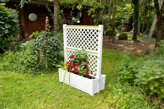 Pflanzkasten mit Zentralspalier 100 cm, für die beidseitige Bepflanzung mit Kübelpflanzen bzw. Rankpflanzen. Abmessungen aufgebaut B 100 x T 43 x H 140 cm. Hergestellt aus 100 % Kunststoff, pflegeleicht und UV-stabil. Einfache Montage ohne zusätzliches Werkzeug – nur durch Zusammenstecken der einzelnen Teile. Kombinierbar mit weiteren Rankgittern und Pflanzgefäßen dieser Serie.