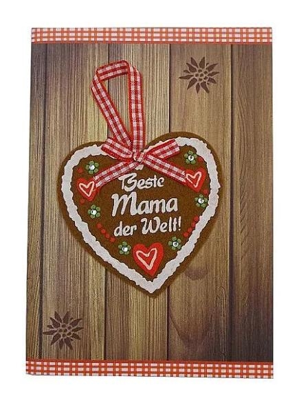 Grußkarte für die beste Mama der Welt - ideal zum Muttertag   Die beste Grußkarte ist gerade gut genug für die beste Mama der Welt! Was gesagt werden muss, muss gesagt werden! Und dazu gehört es, die beste Mama mit einer passenden Grußkarte zu ehren. Das besondere an dieser Klappkarte ist, dass sie vorn und innen bedruckt ist. Vorn steht im Herz: "Beste Mama der Welt!". Der Text innen lautet:"Es ist so schön, dass es dich gibt!" - "Alles Liebe!". Ein bisschen erinnert diese Grußkarte an das Oktoberfest. Bunt und fröhlich kommt sie daher und das Lebkuchenherz ist typisch. Ähnliche Produkte mit Lebkuchenherz finden Sie unter diesem Produktangebot. Grußkarten aus unserem Geschenkeshop für jede Gelegenheit Über Grußkarten freut sich jeder, auch wenn sie ein bisschen aus der Mode gekommen zu sein scheinen. Es sind "handfeste" Danksagungen oder Einladungen. Denn im Vergleich zu Grußkarten, die elektronisch versendet werden, kann man Klappkarten als Grußkarten zu Hause oder im Büro aufstellen und hat sie so immer vor Augen. Wir bieten Ihnen Grußkarten für jeden Geschmack. Denn ein ansprechendes Design spielt bei den persönlichen Grüßen immer eine Rolle. Für eine Hochzeitskarte zum Beispiel ist es ganz besonders wichtig, das die "Aufmachung" der Grußkarte zu diesem äußerst festlichen Anlass passt. Einladungskarten werden häufig in einer größeren Stückzahl benötigt. Wer hat schon Zeit und Geschick genug, diese selbst zu basteln? Kaufen Sie Einladungskarten und Grußkarten deshalb bei uns im Geschenkeshop mit. Das Geschenk und die Grußkarten zusammen in einem Warenkorb sparen Porto und Aufwand. Da Sie Grußkarten immer selbst beschriften, wirken Sie beim Empfänger letztendlich doch persönlich und individuell. Bunt und fröhlich dürfen die Geburtstagskarten mit Ihren Grüßen wirken, edel und seriös sehen die Hochzeitskarten aus. Für offizielle und private Gelegenheiten finden Sie garantiert die richtige Grußkarte.  Dankeskarten sind zum Beispiel auch eine sehr schöne Möglichkeit, mit jemandem eine Beziehung zu pflegen. Egal, ob diese Grußkarte als Dank für die Geschenke nach einem Fest versendet wird, oder ob die Dankeskarte jemanden zwischendurch erreicht, dem man einfach einmal von ganzem Herzen "Danke" sagen möchte. Unsere Grußkarten sind im Gegensatz zu den Grußkarten, die in so manchem Ladengeschäft erhältlich sind, weder altmodisch noch kitschig und da es sich um Klappkarten handelt, haben Sie genügend Platz für persönliche Zeilen. Auch ein Foto oder ein Geldschein findet in den Grußkarten Platz.