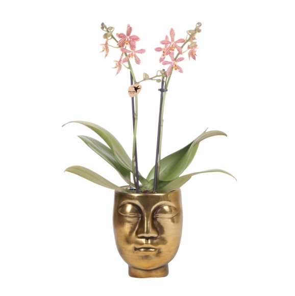 Produktbeschreibung: Die Spider Orchidee von Kolibri Orchids ist eine einzigartige und wunderschöne Ergänzung für jedes Interieur. Mit ihren eleganten, orangefarbenen Blüten und auffälligen Farben zieht diese besondere Phalaenopsis Orchidee mühelos alle Blicke auf sich. Bekannt für ihre langen, dünnen Blütenblätter, die wie Spinnenbeine aussehen, bietet die Spider Orchidee exotische Schönheit und gedeiht hervorragend in Innenräumen. Kombiniert mit dem luxuriösen Face-2-Face Gold Topf in der Größe Ø9cm, schafft diese Orchidee eine stilvolle und beeindruckende Präsentation.. Produkthighlights:. Elegante, orangefarbene Blüten mit langen, dünnen Blütenblättern. Inklusive dekorativem Face-2-Face Gold Keramiktopf. Fördert eine gesunde Luftqualität durch Luftreinigung. Pflegeleicht und ideal für Innenräume. Ideal für: Dieses Orchideen-Set ist ideal für Pflanzenliebhaber, die eine außergewöhnliche und pflegeleichte Zimmerpflanze suchen. Perfekt für Wohnzimmer, Büros, Eingangsbereiche und als exklusives Geschenk.. Was ist im Produkt enthalten:. Eine orangefarbene Phalaenopsis Orchidee (Spider) mit 2-3 Zweigen. Face-2-Face Gold Keramiktopf (Ø9cm). Gattung/Botanischer Name: Phalaenopsis. Standort: Bevorzugt einen hellen Standort ohne direkte Sonneneinstrahlung. Ideal für Fensterbänke, Tische oder Regale.. Pflegeaufwand: Niedriger bis mittlerer Pflegeaufwand. Einmal pro Woche gießen, indem der Topf in Wasser getaucht wird. Gut abtropfen lassen.. Besondere Eigenschaften:. Produziert nachts Sauerstoff. Fördert eine gesunde Luftqualität durch Luftreinigung. Übertopfgröße: Face-2-Face Gold Keramiktopf (Ø9cm). Wachstumsrate: Langsam wachsend, regelmäßiges Umtopfen alle 1-2 Jahre empfohlen. Empfohlene Temperatur: 18-25°C, vor extremen Temperaturschwankungen schützen. Düngemittel: Während der Wachstumsperiode alle 2-4 Wochen mit einem Orchideendünger düngen. Topfmaterialien: Keramik. Anmerkungen zur Blattpflege: Blätter regelmäßig mit einem feuchten Tuch abwischen, um Staub zu entfernen und die Luftreinigungsfunktion zu unterstützen.. Umtopfen: Alle 1-2 Jahre in einen größeren Topf umtopfen, vorzugsweise im Frühjahr.