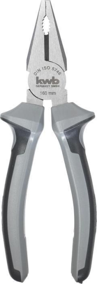 kwb Profi Kombi-Zange 160 mmKombizangen-Form nach DIN ISO 5746, Rohklinge geschmiedet in Deutschland, fein polierter, blendfreier Karbon-Stahl.2-Komponentengriff für optimale Kraftübertragung und ermüdungsfreies Arbeiten, mit Greifzonen für Flach- und Rundmaterial.Mit flachen Schneiden und abgeschrägten Kopfkanten, Schneiden zusätzlich induktiv gehärtet, für harten und weichen Draht.Sehr hohe Qualität für eine lange Lebensdauer.