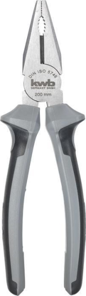 kwb Profi Kombi-Zange 200 mmKombizangen-Form nach DIN ISO 5746, Rohklinge geschmiedet in Deutschland, fein polierter, blendfreier Karbon-Stahl.2-Komponentengriff für optimale Kraftübertragung und ermüdungsfreies Arbeiten, mit Greifzonen für Flach- und Rundmaterial.Mit flachen Schneiden und abgeschrägten Kopfkanten, Schneiden zusätzlich induktiv gehärtet, für harten und weichen Draht.Sehr hohe Qualität für eine lange Lebensdauer.