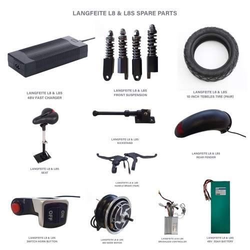 LANGFEITE KOMPLETTSET L8S ERSATZTEILEHINWEIS: L8S und L8 sind das gleiche Produkt!Gilt auch für andere Elektroroller!Beim Kauf eines Langfeite L8S Elektrofahrrads erhalten Sie einenkompletten Satz Langfeite L8S Ersatzteile im Wert von 400 Euro!LANGFEITE ERSATZTEILEThe ENGWE X5S electric bicycle meets WAS IST ENTHALTEN?FrontlichtBremsbelagUmschalttasteNeue Griffe (Paar)SeitenlichtKotflügel hintenStänderFaltstückSitze10 Zoll schlauchloser Reifen (Paar)Vorderradaufhängung 48V Ladegerät