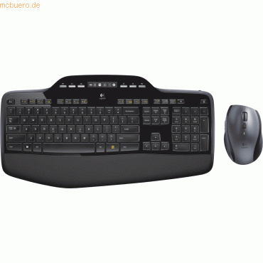 Logitech Desktop Set MK710, kabellos, schwarz/anthrazit; kabellose 2,4 GHz-Technologie; Logitech Unifying-Empfänger; Tastatur mit LCD-Dashboard; konkave Tasten; lauffähig ab; Windows XP; deutsche Tastaturbelegung; Maus: 1.000 dpi (920-002420); Maße Tastatur: (B)460 x (T)245 x (H)30 mm; Maße: Maus: (B)72x (T)109x (H)42 mm; Lieferumfang: Tastatur, Maus, 2,4 GHz-Unifying-USB-Empfänger; 4 x Typ-AA Batterien, Software-CD, Bedienungsanleitung;