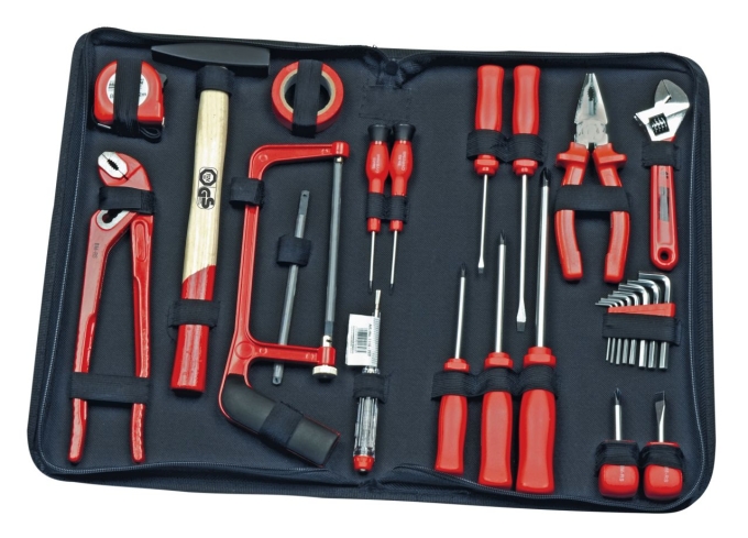 Werkzeugmappe ist gefertigt aus hochwertigem Kunstleder, 26 der gebräuchlichsten Qualitätswerkzeuge auf kleinstem Raum
