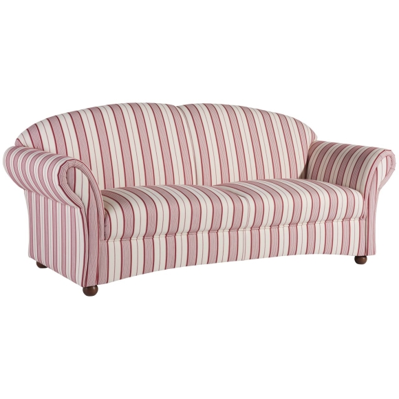 Vollpolstersofa mit Chatosenseitenteil im Landhausstil. Romantisch verspielt gibt dieses wunderschöne Sofa Ihrem Raum eine besondere Note. Das gestreifte Flachgewebe verleiht ein maritmes Flair. Die dunklen Buchefüße runden das Gesamtbild ab. Der Rücken ist mit Originalstoff bezogen, somit ist das Sofa frei im Raum stellbar. Die Füße sind zur einfachen Selbstmontage. ·202x81x85 in cm (BxTxH) ·Nettogewicht 53 kg ·Flachgewebe ·50% Baumwolle, 50% Polyester ·Sitzhärte mittel ·Anzahl Sitze 3 ·Wellenunterfederung, schaumummantelter Federkern, Polyätherschaum, Diolenabdeckung ·Fußfarbe Buche nussbaum dunkel ·stabiles Holzgrundgestell aus Massivholz und Holzwerkstoffen ·Bodenfreiheit 6 cm ·Armteilhöhe innen vorn/hinten 20 / 24 cm ·Höhe ohne Füße 68 cm ·Rückenhöhe innen 43 cm ·Sitzbreite vorn/hinten154 cm ·Sitztiefe 53 cm ·Sitzhöhe 44 cm