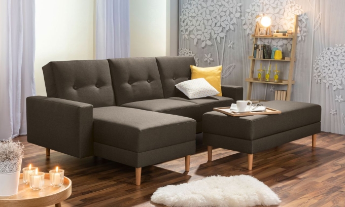 Zeitlos klassische Longchair-Garnitur mit aufwendiger Knopfheftung im Rücken und edlen Füßen aus massivem Holz. Der Longchair ist wahlweise rechts oder links montierbar. Damit passt sich die Garnitur Ihrer individuellen Wohnsituation an. Die Rückenlehne ist 5-fach verstellbar. Für optimalen Sitzkomfort sorgt ein schaumummantelter Federkern in der Sitzfläche. Der mitgelieferte Stauraumhocker ergänzt die Garnitur perfekt und lässt sich am Sofa fixieren. In Verbindung mit der zurückgeklappten Rückenlehne entsteht so eine große Liegefläche von ca. 170 x 200 cm. ·230x152x93 in cm (BxTxH) ·Nettogewicht 56 kg ·Flachgewebe ·100% Polyester ·Sitzhärte mittel ·Anzahl Sitze 6 cm ·Wellenunterfederung, schaumummantelter Einzelfederkern, Polyätherschaum, Diolenabdeckung ·Fußfarbe Erle natur ·stabiles Holzgrundgestell aus Massivholz und Holzwerkstoffen ·Bodenfreiheit 14 cm ·Armteilhöhe innen vorn/hinten 17 cm ·Höhe ohne Füße 68 cm ·Rückenhöhe innen 47 cm ·Sitzbreite vorn/hinten65 / 135 cm ·Sitztiefe 50 / LC 110 cm ·Sitzhöhe 47 cm
