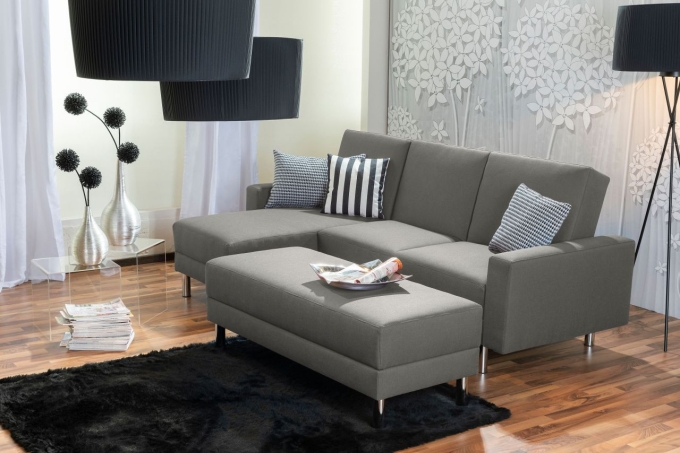 Moderne Longchair-Garnitur in schlichtem, zeitlosen Design. Der Longchair ist wahlweise rechts oder links montierbar. Damit passt sich die Garnitur Ihrer individuellen Wohnsituation an. Die Rückenlehne ist 5-fach verstellbar. Für optimalen Sitzkomfort sorgt ein schaumummantelter Federkern in der Sitzfläche. Der mitgelieferte Stauraumhocker ergänzt die Garnitur perfekt und lässt sich am Sofa fixieren. In Verbindung mit der zurückgeklappten Rückenlehne entsteht so eine große Liegefläche von ca. 170 x 200 cm. Die verchromten Metallfüße unterstreichen den modernen Look. ·230x152x93 in cm (BxTxH) ·Nettogewicht 56 kg ·Flachgewebe ·100% Polyester ·Sitzhärte mittel ·Anzahl Sitze 6 cm ·Wellenunterfederung, schaumummantelter Einzelfederkern, Polyätherschaum, Diolenabdeckung ·Fußfarbe Metall chromfarben ·stabiles Holzgrundgestell aus Massivholz und Holzwerkstoffen ·Bodenfreiheit 14 cm ·Armteilhöhe innen vorn/hinten 17 cm ·Höhe ohne Füße 68 cm ·Rückenhöhe innen 47 cm ·Sitzbreite vorn/hinten65 / 135 cm ·Sitztiefe 50 / LC 110 cm ·Sitzhöhe 47 cm
