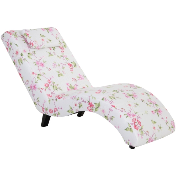 Extravagante Liege mit romantischem Bezug. Die geschwunge Form der Liege lädt zum Relaxen ein. Unterstützt wird der Liegekomfort durch das Kissen im Kopfbereich, welches an der Rückseite angenäht ist. Die Füße sind zur einfachen Selbstmontage. ·65x163x84 in cm (BxTxH) ·Nettogewicht 18 kg ·Flachgewebe ·50 % Polyester, 50 % Baumwolle ·Sitzhärte fest ·Anzahl Sitze 2 ·Gurtunterfederung, Polyätherschaum, Diolenabdeckung ·Fußfarbe Buche schwarz lackiert; Kunststoff ·stabiles Holzgrundgestell aus Massivholz und Holzwerkstoffen ·Bodenfreiheit 3 / 15 cm ·Armteilhöhe innen vorn/hinten  cm ·Höhe ohne Füße 68 cm ·Rückenhöhe innen 54 cm ·Sitzbreite vorn/hinten65 cm ·Sitztiefe 98 cm ·Sitzhöhe 42 cm