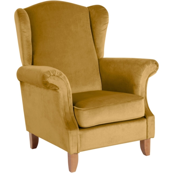 Ein eleganter Ohrenbackensessel im klassischen Design. Die raffiniert geschwungenen Armlehnen machen ihn zu einem besonderen Blickfang. Das lose Sitzkissen, auf einem massiven Holzuntergestell, ist mittels Klettverschluss befestigt, somit rutscht es nicht weg. Die Füße sind zur einfachen Selbstmontage. ·88x84x108 in cm (BxTxH) ·Nettogewicht 30 kg ·Samtvelours ·100% Polyester ·Sitzhärte mittel ·Anzahl Sitze 1 ·Wellenunterfederung, Sitzkissen lose mit Klettverschluss befestigt ·Fußfarbe Buche natur ·stabiles Holzgrundgestell aus Massivholz und Holzwerkstoffen ·Bodenfreiheit 16 cm ·Armteilhöhe innen vorn/hinten 21 cm ·Höhe ohne Füße 68 cm ·Rückenhöhe innen 65 cm ·Sitzbreite vorn/hinten49 cm ·Sitztiefe 54 cm ·Sitzhöhe 49 cm