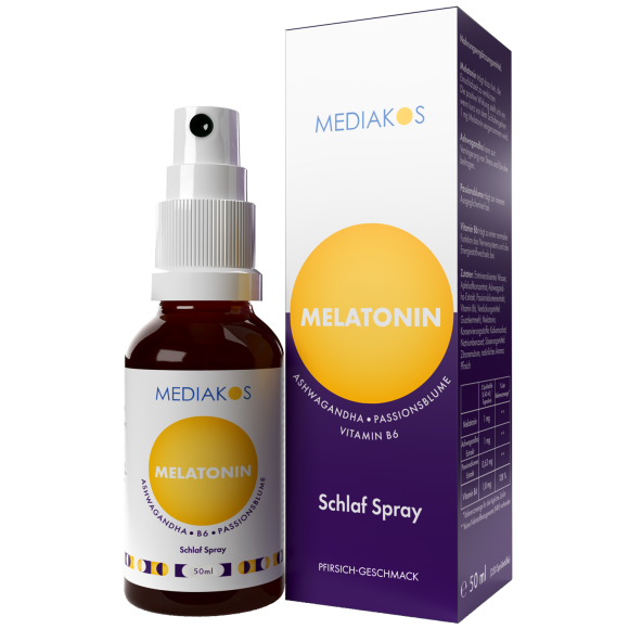 Nahrungsergänzungsmittel in Form von Mundspray mit Melatonin, Vitamin B6, Ashwagandha-Extrakt und Passionsblumen-Extrakt.