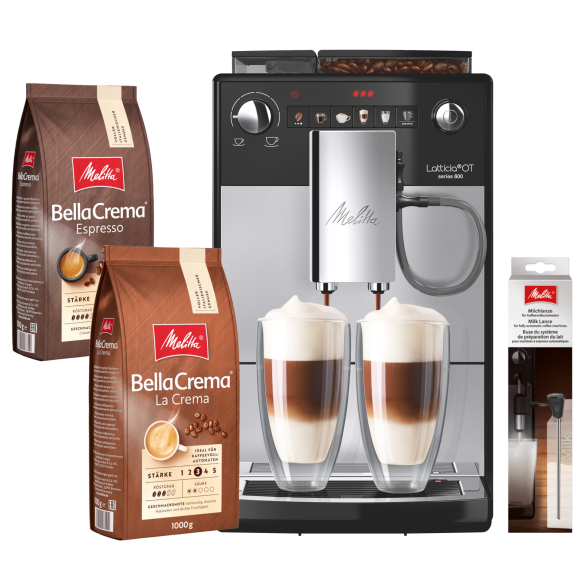 Erlebe mit dem Melitta® Latticia® OT Genuss-Set Kaffee-Spezialitäten wie in Deinem Lieblingscafé, ganz bequem auf Knopfdruck. Dieses exklusive Set enthält neben dem kompakten Kaffeevollautomaten eine zusätzliche Milchlanze und 2 kg unserer feinsten Kaffees - BellaCrema® LaCrema und BellaCrema® Espre...