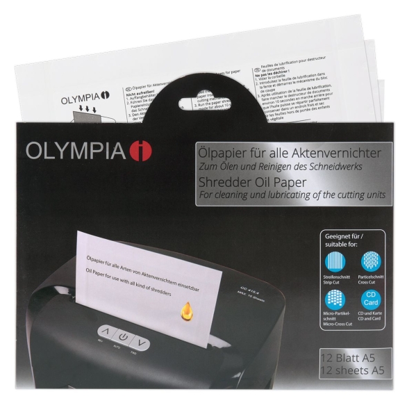 Ölpapier für alle Arten von Aktenvernichtern Verlängert die Lebensdauer des Geräts Perfekt dosiertes Pflegemittel, Öl auf pflanzlicher Basis Einfach zu benutzen, keine Rückstände Handhabung: Ölblatt für Aktenvernichter - Nicht aufreißen! Leeren des Papierkorbes empfohlen Führen Sie das Ölpapier in den Papier-Schlitz ein und starten Sie das Schneidewerk Nun wird das Blatt zerschnitten und das Öl tritt aus Anschließend das Gerät ca. 10 Sekunden im Rücklaufbetrieb laufen lassen Sie können den Aktenvernichter wieder normal gebrauchen Umschlagstasche enthält 12 Blatt Ölpapier in der Größe A5