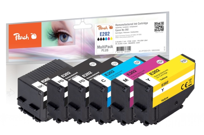 Peach Spar Packs - Sparen Sie zusätzlich gegenüber dem Einzelkauf!6 Tintenpatronen.1.00 x Peach Tintenpatrone magenta kompatibel zu Epson T02F3, No. 202 m, C13T02F340101.00 x Peach Tintenpatrone cyan kompatibel zu Epson T02F2, No. 202 c, C13T02F240102.00 x Peach Tintenpatrone schwarz kompatibel zu Epson T02E1, No. 202 bk, C13T02E140101.00 x Peach Tintenpatrone foto schwarz kompatibel zu Epson T02F1, No. 202 phbk, C13T02F140101.00 x Peach Tintenpatrone gelb kompatibel zu Epson T02F4, No. 202 y, C13T02F44010Peach ist eine führende Schweizer Marke für kompatible Tintenpatronen. Spitzentechnologie gewährleistet höchste Qualität und führt zu herrvoragenden Ergebnissen. Farb- und Lichtechtheit entsprechen höchsten Anforderungen und gewährleisten brillante Druckresultate. Um die Premium Qualität sicherzustellen, wird die Tinte im eigenen Entwicklungszentrum in der Schweiz entwickelt und anschliessend in unseren Fertigungsstandorten in die Tintenpatronen abgefüllt. Produktion und Fertigung entsprechen neusten Erkenntnissen aus Lehre und Forschung. Qualität, mit der asiatische Hersteller nicht gleichziehen können und dies zu immer noch sehr attraktiven Preisen. Eine echte Alternative zu teuren Original Produkten oder Billigsttinten.