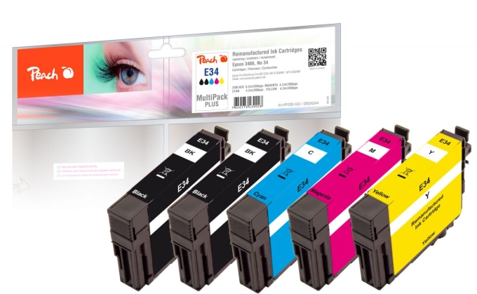 Peach Spar Packs - Sparen Sie zusätzlich gegenüber dem Einzelkauf!6 Tintenpatronen.1.00 x Peach Tintenpatrone magenta kompatibel zu Epson T3463, No. 34 m, C13T346340102.00 x Peach Tintenpatrone schwarz kompatibel zu Epson T3461, No. 34 bk, C13T346140101.00 x Peach Tintenpatrone gelb kompatibel zu Epson T3464, No. 34 y, C13T346440101.00 x Peach Tintenpatrone cyan kompatibel zu Epson T3462, No. 34 c, C13T34624010Peach ist eine führende Schweizer Marke für kompatible Tintenpatronen. Spitzentechnologie gewährleistet höchste Qualität und führt zu herrvoragenden Ergebnissen. Farb- und Lichtechtheit entsprechen höchsten Anforderungen und gewährleisten brillante Druckresultate. Um die Premium Qualität sicherzustellen, wird die Tinte im eigenen Entwicklungszentrum in der Schweiz entwickelt und anschliessend in unseren Fertigungsstandorten in die Tintenpatronen abgefüllt. Produktion und Fertigung entsprechen neusten Erkenntnissen aus Lehre und Forschung. Qualität, mit der asiatische Hersteller nicht gleichziehen können und dies zu immer noch sehr attraktiven Preisen. Eine echte Alternative zu teuren Original Produkten oder Billigsttinten.
