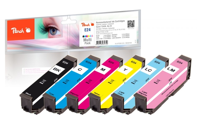Peach Spar Packs - Sparen Sie zusätzlich gegenüber dem Einzelkauf!6 Tintenpatronen.1.00 x Peach Tintenpatrone light cyan kompatibel zu Epson No. 24 lc, C13T242540101.00 x Peach Tintenpatrone light magenta kompatibel zu Epson No. 24 lm, C13T242640101.00 x Peach Tintenpatrone magenta kompatibel zu Epson No. 24 m, C13T242340101.00 x Peach Tintenpatrone gelb kompatibel zu Epson No. 24 y, C13T242440101.00 x Peach Tintenpatrone schwarz kompatibel zu Epson No. 24 bk, C13T242140101.00 x Peach Tintenpatrone cyan kompatibel zu Epson No. 24 c, C13T24224010Peach ist eine führende Schweizer Marke für kompatible Tintenpatronen. Spitzentechnologie gewährleistet höchste Qualität und führt zu herrvoragenden Ergebnissen. Farb- und Lichtechtheit entsprechen höchsten Anforderungen und gewährleisten brillante Druckresultate. Um die Premium Qualität sicherzustellen, wird die Tinte im eigenen Entwicklungszentrum in der Schweiz entwickelt und anschliessend in unseren Fertigungsstandorten in die Tintenpatronen abgefüllt. Produktion und Fertigung entsprechen neusten Erkenntnissen aus Lehre und Forschung. Qualität, mit der asiatische Hersteller nicht gleichziehen können und dies zu immer noch sehr attraktiven Preisen. Eine echte Alternative zu teuren Original Produkten oder Billigsttinten.