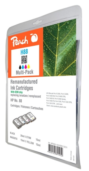 Peach Spar Packs - Sparen Sie zusätzlich gegenüber dem Einzelkauf!100% Neuer Chip inkl. Tintenstandsanzeige.1 x Peach Tintenpatrone cyan kompatibel zu HP No. 88 c, C9386AE1 x Peach Tintenpatrone schwarz kompatibel zu HP No. 88 bk, C9385AE1 x Peach Tintenpatrone magenta kompatibel zu HP No. 88 m, C9387AE1 x Peach Tintenpatrone gelb kompatibel zu HP No. 88 y, C9388AEPeach ist eine führende Schweizer Marke für kompatible Tintenpatronen. Spitzentechnologie gewährleistet höchste Qualität und führt zu herrvoragenden Ergebnissen. Farb- und Lichtechtheit entsprechen höchsten Anforderungen und gewährleisten brillante Druckresultate. Um die Premium Qualität sicherzustellen, wird die Tinte im eigenen Entwicklungszentrum in der Schweiz entwickelt und anschliessend in unseren Fertigungsstandorten in die Tintenpatronen abgefüllt. Produktion und Fertigung entsprechen neusten Erkenntnissen aus Lehre und Forschung. Qualität, mit der asiatische Hersteller nicht gleichziehen können und dies zu immer noch sehr attraktiven Preisen. Eine echte Alternative zu teuren Original Produkten oder Billigsttinten.