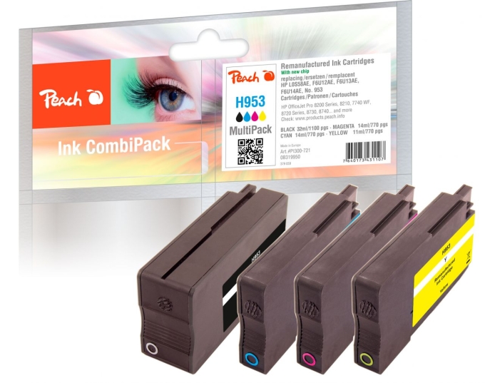 100% Neuer Chip inkl. Tintenstandsanzeige.1.00 x Peach Tintenpatrone magenta kompatibel zu HP No. 953 m, F6U13AE1.00 x Peach Tintenpatrone schwarz kompatibel zu HP No. 953 bk, L0S58AE1.00 x Peach Tintenpatrone gelb kompatibel zu HP No. 953 y, F6U14AE1.00 x Peach Tintenpatrone cyan kompatibel zu HP No. 953 c, F6U12AEPeach ist eine führende Schweizer Marke für kompatible Tintenpatronen. Spitzentechnologie gewährleistet höchste Qualität und führt zu herrvoragenden Ergebnissen. Farb- und Lichtechtheit entsprechen höchsten Anforderungen und gewährleisten brillante Druckresultate. Um die Premium Qualität sicherzustellen, wird die Tinte im eigenen Entwicklungszentrum in der Schweiz entwickelt und anschliessend in unseren Fertigungsstandorten in die Tintenpatronen abgefüllt. Produktion und Fertigung entsprechen neusten Erkenntnissen aus Lehre und Forschung. Qualität, mit der asiatische Hersteller nicht gleichziehen können und dies zu immer noch sehr attraktiven Preisen. Eine echte Alternative zu teuren Original Produkten oder Billigsttinten.
