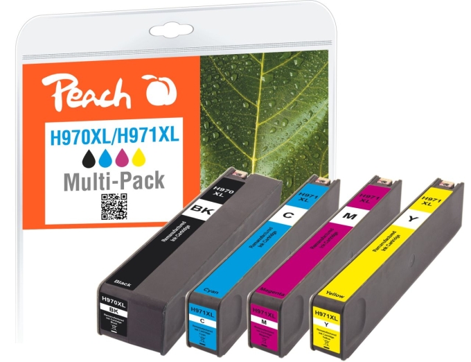 100% Neuer Chip inkl. Tintenstandsanzeige.1 x Peach Tintenpatrone gelb HC kompatibel zu HP No. 971XL y, CN628A1 x Peach Tintenpatrone magenta HC kompatibel zu HP No. 971XL m, CN627A1 x Peach Tintenpatrone cyan HC kompatibel zu HP No. 971XL c, CN626A1 x Peach Tintenpatrone schwarz HC kompatibel zu HP No. 970XL bk, CN625APeach ist eine führende Schweizer Marke für kompatible Tintenpatronen. Spitzentechnologie gewährleistet höchste Qualität und führt zu herrvoragenden Ergebnissen. Farb- und Lichtechtheit entsprechen höchsten Anforderungen und gewährleisten brillante Druckresultate. Um die Premium Qualität sicherzustellen, wird die Tinte im eigenen Entwicklungszentrum in der Schweiz entwickelt und anschliessend in unseren Fertigungsstandorten in die Tintenpatronen abgefüllt. Produktion und Fertigung entsprechen neusten Erkenntnissen aus Lehre und Forschung. Qualität, mit der asiatische Hersteller nicht gleichziehen können und dies zu immer noch sehr attraktiven Preisen. Eine echte Alternative zu teuren Original Produkten oder Billigsttinten.