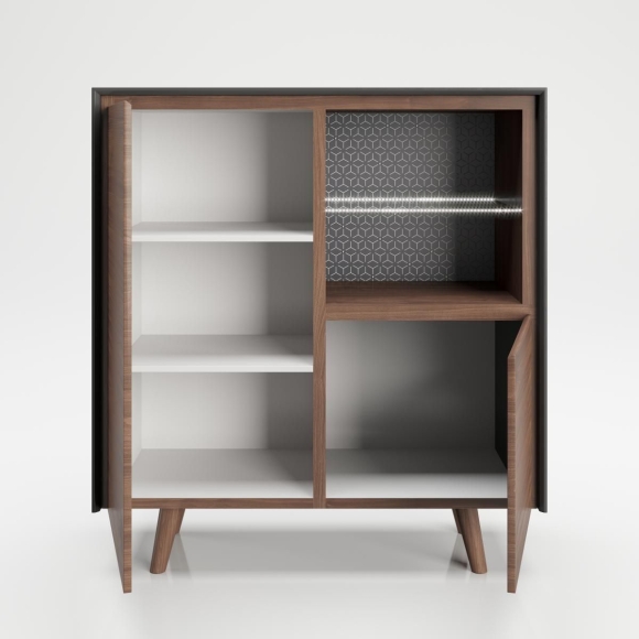 Playboy Hochkommode VICTORIADie Kommode "Victoria" aus der PLAYBOY-HOME Kollektion ist im Club-Stil der 60er Jahre gehalten. Der graue Korpus kombiniert mit dem Nussbaum-Dekor und Massivholzfüssen runden das Retro-Design vollkommen ab. Die praktische Kommode mit 2 Türen und 2 offenen Fächern bieten genügend Stauraum und Ablagefläche für Ihre Dinge. Die integrierten LEDs am Glasboden sorgen für zusätzliche Beleuchtung. Die Schubladen mit Soft-Close lassen sich durch die gefrästen Fronten einfach öffnen und durch leichtes anstossen sanft schliessen. HIGHLIGHTSB/H/T: 90x116.8x42cm2 Türen, sanft schliessend2 offene Fächer mit Glasboden und LEDWalnuss Dekorgrauer KorpusFernbedienung für die LEDsVintage-Stil der 60er JahrePLAYBOY Retro-Design MATERIAL100% FSC zertifizierte Spanplatte, MelaminbeschichtungMetall, Soft-Close-BeschlägeMassivholzfüsseGlasLEDs Alle Artikel der PLAYBOY-HOME Kollektion sind farblich und im Design aufeinander abgestimmt. Alle Möbel und Accessoires ergeben zusammen ein wertiges und stimmiges Gesamtkonzept.