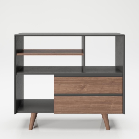 Playboy Regal VICTORIA Der Raumteiler "Victoria" aus der PLAYBOY-HOME Kollektion ist im Club-Stil der 60er Jahre gehalten. Der graue Korpus kombiniert mit dem Nussbaum-Dekor und Massivholzfüssen runden das Retro-Design vollkommen ab. Das praktische Regal mit 4 Fächern und mit 2 Schubladen bieten genügend Stauraum und Ablagefläche für Ihre Dinge. Die Schubladen mit Soft-Close Technik lassen sich durch die gefrästen Kanten einfach öffnen und durch leichtes anstossen sanft schliessen. Alle Artikel der PLAYBOY-HOME Kollektion sind farblich und im Design aufeinander abgestimmt. Alle Möbel und Accessoires ergeben zusammen ein wertiges Gesamtkonzept. HIGHLIGHTS B/H/T: 110x97.4x38cm Walnuss Dekor Grauer Korpus 2 Schubladen mit Soft-Close 4 offene Fächer auch als Raumteiler geeignet Vintage-Stil der 60er Jahre PLAYBOY Retro-Design MATERIAL 100% FSC zertifizierte Spanplatte, Melaminbeschichtung Metall, Soft-Close Beschläge Massivholzfüsse Alle Artikel der PLAYBOY-HOME Kollektion sind farblich und im Design aufeinander abgestimmt. Alle Möbel und Accessoires ergeben zusammen ein wertiges und stimmiges Gesamtkonzept.