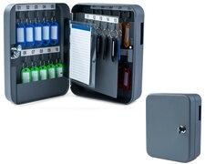 Schlüsselkasten mit 30 Haken und Einwurfschlitz -Anzahl Schlüsselhaken: 30 -Verschlussart: Zylinderschloss mit 2 Schlüsseln -Material: Stahl -Farbe: grau -Maße (BxHxT): 20 x 16 x 8cm -Gewicht: 1,14kg -Befestigung: 2 Bohrungen in der Rückwand -sonstiges: mit Hakenleisten, schwenkbarem Schlüsselregisterindex und Nummerierung, seitlicher Einwurfschlitz zur Schlüsselrückgabe -Einwurfschlitz: 46mm -Inkl. Befestigungsmaterial und 30 Schlüsselanhängern (Farblich sortiert) Bitte beachten Sie, dass manchmal Farbabweichungen zwischen Monitorbild und Produkt auftreten können.
