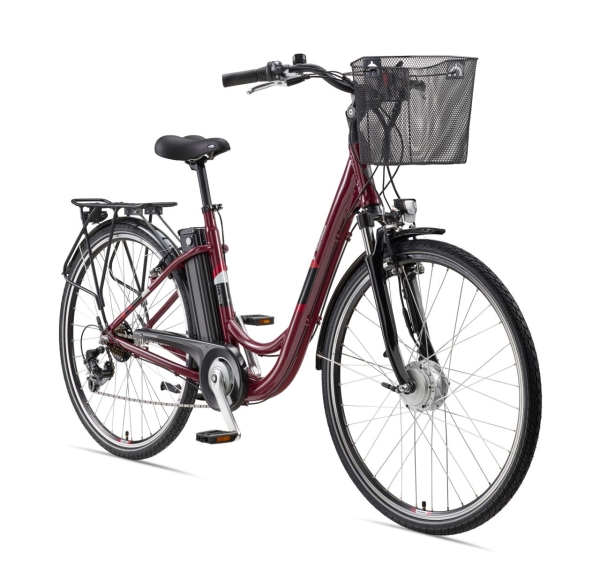 img{max-width:100%}Telefunken 28 Zoll City E-Bike Multitalent RC822 Auf einen Blick:Flexibilität: Das Pedelec E-Bike mit 28 Zoll Reifen ist dank Aluminum-Rahmen sehr leicht - mit der 7-Gang Shimano-Kettenschaltung machen das Citybike alltagstauglichReichweite: Die Kombination aus integriertem Telefunken Vorderrad Nabenmotor mit 250 Watt und hochwertigem Sitzrohrakku sorgt bei bis zu 25 km/h für Tretunterstützung mit einer Reichweite von bis zu 100 km je nach BeanspruchungTechnik: Ein LCD-Display versorgt Sie während der Fahrt mit allen wissenswerten Informationen wie z.B. zurückgelegte Strecke, Geschwindigkeit oder Akku-LadezustandKomfort: Das Elektrofahrrad wird zu 98% montiert angeliefert - der Selle Royal Sattel mit Alu-Sattelstütze und der City-Fahrradlenker mit Ergo-Griffen erhöhen zusätzlich den KomfortSicherheit: Das Ebike ist nicht zulassungspflichtig und bietet die vollständige Ausstattung nach StVZO (LED-Beleuchtung und Reflexbereifung) - V-Bremsen sorgen für SicherheitTechnik die begeistertDas Pedelec Citybike mit Elektroantrieb der Qualitätsmarke Telefunken ist für alle geeignet, die sich bequeme Mobilität im Alltag in Form eines Elektro-Fahrrads wünschen. Egal ob täglicher Weg zur Arbeit, einem gemütlichen Wochenendausflug oder einer mehrtägigen Fahrrad-Reise. Das E-Bike in weinrot kommt in der komfortablen, Damen-typischen Form mit tiefem Einstieg, ist aber ausdrücklich für jeden geeignet (Unisex). Der Aluminium-Rahmen sorgt für ein niedriges Gewicht (24 kg), sodass bei Bedarf auch das Tragen gut möglich ist.Die Reichweite eines Pedelecs ist u. a. maßgeblich von folgenden Faktoren abhängig:gewählte UnterstützungsstufeBeladung des Bikes (Gewicht des Fahrers/der Fahrerin zzgl. Gepäck)Geländeprofil (Ebenen/Steigungen/Gefälle)gewählter GangUntergrund (Asphalt, Feldweg, Schotterstrecke, Waldboden, matschiger Untergrund)E-Bike-Typ und BereifungReifendruckLadezustand des AkkusAußentemperaturWindverhältnisseTrittfrequenzDie persönliche Reichweite ergibt sich aus dem Mix der oben angeführten Punkte und hat eine sehr große Spannbreite zwischen ca. 25% - 150% des angegebenen Reichweitenwertes. Die besten Reichweitenwerte erreichen Sie bei mittlerer Unterstützungsstufe, möglichst niedrigem Gang bei hoher Trittfrequenz Gewicht der Zuladung inkl. Gepäck bei 75 Kilogramm, maximal zulässiger Reifendruck, ebener Strecke, 20 °C Aussentemperatur, Windstille, asphaltiertem Untergrund und voll geladenem Akku. Nicht zu verwechseln ist ein Pedelec mit einem benzin- oder elektrisch angetriebenen Fahrzeug. Die Reichweite des Pedelecs addiert sich aus der menschlichen und elektrischen Leistung.