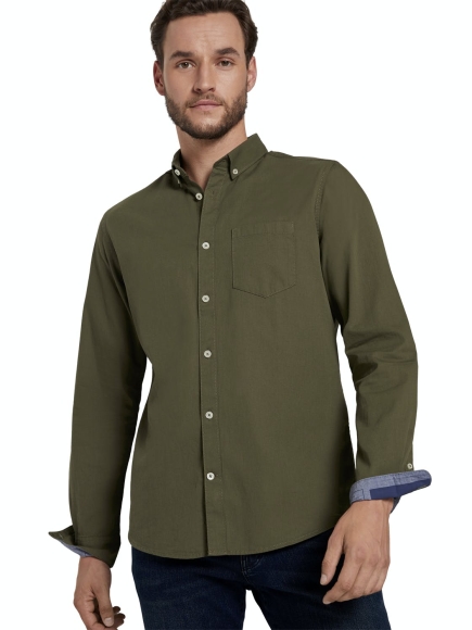Elegantes Tom Tailor Baumwoll-Hemd für HerrenDetails+ Farbe: olive+ Kentkragen mit Zierknöpfen+ Knopfleiste und Brusttasche+ maskuliner Schnitt+ Ärmelenden mit Manschettenknöpfen+ LogopatchMaterial100% Baumwolle