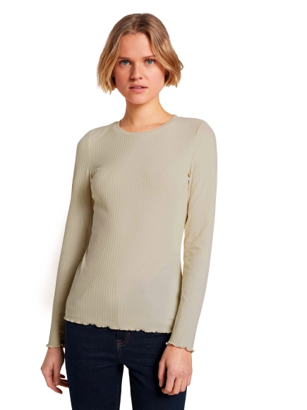 Tom Tailor Langarmshirt in der Farbe ribbed beige. In den Größen S-XL erhältlich. Gerippter Stoff in einer leicht taillierten Passform.<div>Abschlussränder sind leicht gewellt und zeigen Veränderung.&nbsp;</div>