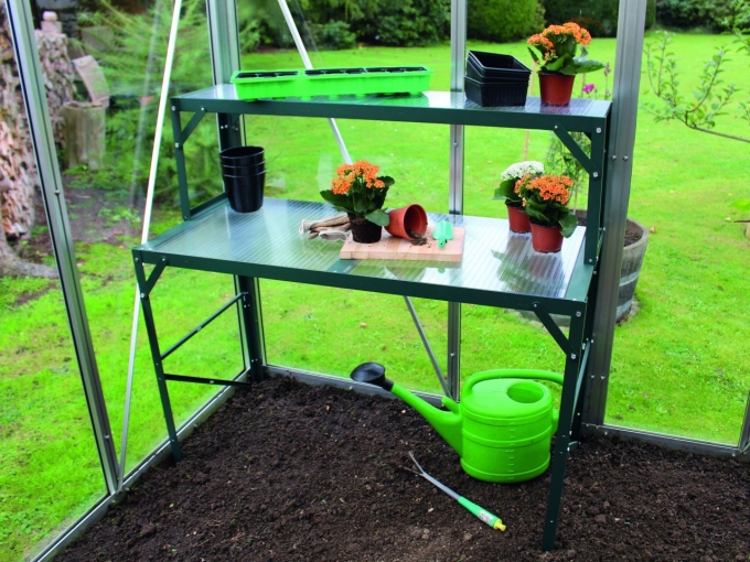 Mit einem solchen Tischaufsatz befreien Sie Ihren Arbeitstisch von Werkzeug oder Anziehtöpfchen, um dann mehr Platz zum Arbeiten zu erhalten. Auch kleine Pflanzen, wie Kräuter, können hierauf hervorragend dauerhaft platziert werden. Da sie passend zum Tisch entwickelt wurden, besitzen sie auch einen stabilen Stand. Aus dem gleichen Material wie die Gewächshausprofile und die Aluminiumische und erhältlich in den passenden Farben der Tische und Gewächshäuser, fügen sie sich schön und unauffällig in Ihr Vitavia Gewächshaus ein und sorgen für den nötigen Platz.
