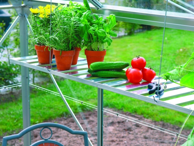 Mit abklappbaren Regalen bleiben Sie in der Raumnutzung flexibel. So können sich z.B. hochwachsende Pflanzen im Laufe des Gartenjahres den Raum erobern, den Sie im Frühjahr noch als Ablage bei Ihren Pflanzarbeiten benötigen. Die Tische sind aus dem gleichen Material wie die Gewächshausprofile und anderen Alu-Tische. Erhältlich in den meisten Gewächshausfarben, fügen sich schön und unaufällig in Ihr Gewächshaus ein.