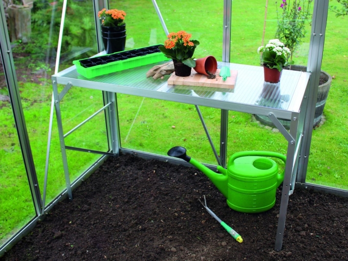 Die Alutische in optimaler Arbeitshöhe bieten mit 54 cm Tiefe fast so viel Platz zum Arbeiten wie eine Standardarbeitsfläche und fügen sich perfekt in kleine und große Gewächshäuser ein – in letzteren werden auch häufig mehrere kombiniert. Zwei Tischplatten mit herausnehmbaren Hohlkammerplatten ermöglichen das Durchwachsen von hochwachsenden Pflanzen unter dem Tisch. Die geteilte Oberfläche stellt dabei sicher, dass bei einer hochwachsenden Pflanze nicht die gesamte Arbeitsplatte weichen muss.