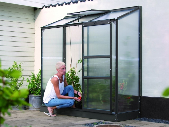 Mit seiner kleinen Grundfläche bei voller Stehhöhe ermöglicht das Anlehngewächshaus Ida auch im Vorgarten, auf der Terrasse oder dem Balkon die Anzucht und den Anbau von Kräutern und Gemüse sowie das Überwintern hoher Kübelpflanzen. Die kleineren Ida Modelle sind in Aluminium eloxiert, Anthrazit (nur 900-3300) oder Smaragd (pulverbeschichtet) erhältlich und werden mit Hohlkammerplatten (HKP) in ca. 4 mm Stärke aus UV-stabilisiertem Polycarbonat (PC) eingedeckt. Die Modelle IDA 900 und 1300 haben eine leichtgängige Schiebetür mit der Breite von 61 cm und einer Höhe von 151 cm, das Modell 3300 hat eine Doppelschiebetür mit der Breite von 122 cm und einer Höhe von 163 cm. Alle drei Modelle sind serienmäßig mit einem Dachfenster ausgestattet. Das Dachfenster dient zur optimalen Be- und Entlüftung. Die Regenrinne gehört zur Standardausstattung. Passend zu allen Modellen ist ein 6 cm hoher Fundamentrahmen aus verzinktem, farbbeschichtetem Stahlblech als Zubehör lieferbar. Die Balkon bzw. Terrassengewächshäuser der Serie Ida können nicht freistehend aufgestellt werden! Eine Hauswand oder stabile Mauer als Rückwand ist notwendig.