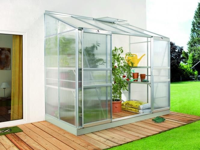 Mit seiner kleinen Grundfläche bei voller Stehhöhe ermöglicht das Anlehngewächshaus Ida auch im Vorgarten, auf der Terrasse oder dem Balkon die Anzucht und den Anbau von Kräutern und Gemüse sowie das Überwintern hoher Kübelpflanzen. Die kleineren Ida Modelle sind in Aluminium eloxiert, Anthrazit (nur 900-3300) oder Smaragd (pulverbeschichtet) erhältlich und werden mit Hohlkammerplatten (HKP) in ca. 4 mm Stärke aus UV-stabilisiertem Polycarbonat (PC) eingedeckt. Die Modelle IDA 900 und 1300 haben eine leichtgängige Schiebetür mit der Breite von 61 cm und einer Höhe von 151 cm, das Modell 3300 hat eine Doppelschiebetür mit der Breite von 122 cm und einer Höhe von 163 cm. Alle drei Modelle sind serienmäßig mit einem Dachfenster ausgestattet. Das Dachfenster dient zur optimalen Be- und Entlüftung. Die Regenrinne gehört zur Standardausstattung. Passend zu allen Modellen ist ein 6 cm hoher Fundamentrahmen aus verzinktem, farbbeschichtetem Stahlblech als Zubehör lieferbar. Die Balkon bzw. Terrassengewächshäuser der Serie Ida können nicht freistehend aufgestellt werden! Eine Hauswand oder stabile Mauer als Rückwand ist notwendig.