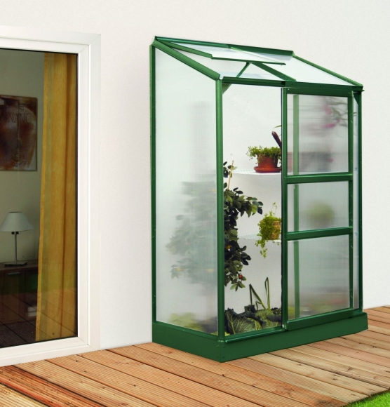 Mit seiner kleinen Grundfläche bei voller Stehhöhe ermöglicht das Anlehngewächshaus Ida auch im Vorgarten, auf der Terrasse oder dem Balkon die Anzucht und den Anbau von Kräutern und Gemüse sowie das Überwintern hoher Kübelpflanzen. Die kleineren Ida Modelle sind in Aluminium eloxiert, Anthrazit (nur 900-3300) oder Smaragd (pulverbeschichtet) erhältlich und werden mit Hohlkammerplatten (HKP) in ca. 4 mm Stärke aus UV-stabilisiertem Polycarbonat (PC) eingedeckt. Die Modelle IDA 900 und 1300 haben eine leichtgängige Schiebetür mit der Breite von 61 cm und einer Höhe von 151 cm, das Modell 3300 hat eine Doppelschiebetür mit der Breite von 122 cm und einer Höhe von 163 cm. Alle drei Modelle sind serienmäßig mit einem Dachfenster ausgestattet. Das Dachfenster dient zur optimalen Be- und Entlüftung. Die Regenrinne gehört zur Standardausstattung. Passend zu allen Modellen ist ein 6 cm hoher Fundamentrahmen aus verzinktem, farbbeschichtetem Stahlblech als Zubehör lieferbar. Die Balkon bzw. Terrassengewächshäuser der Serie Ida können nicht freistehend aufgestellt werden! Eine Hauswand oder stabile Mauer als Rückwand ist notwendig.